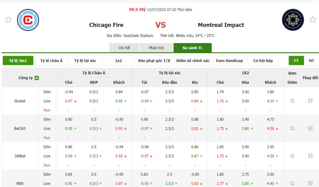 Tỷ lệ kèo trận đấu Chicago Fire vs Montreal Impact