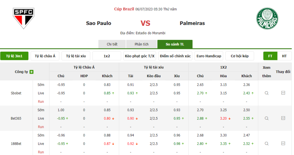 Tỷ lệ kèo trận đấu Sao Paulo vs Palmeiras